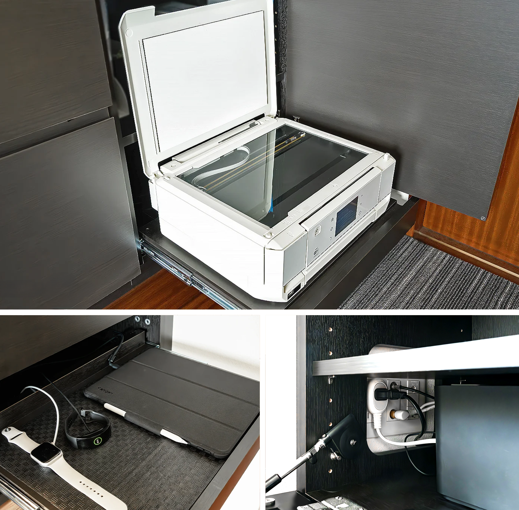 さらに、モバイル端末やプリンター専用の置き場を設けていただいたり、AV機器スペースに熱対策として底板の欠き込みを入れて空気が流れるよう工夫してくださるなど、こちらが気づかない細部までサポートしていただきました。