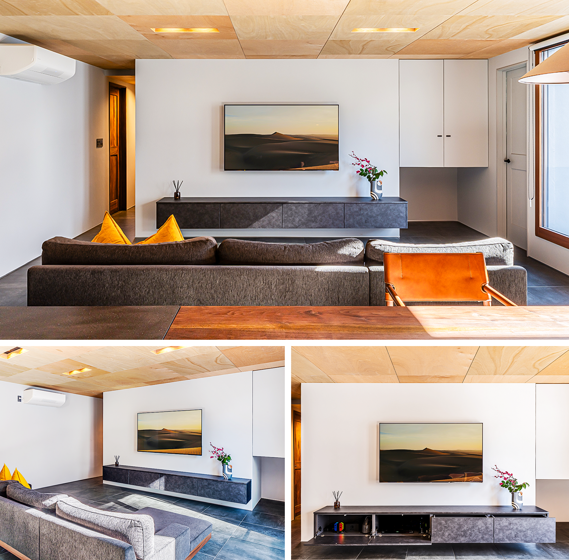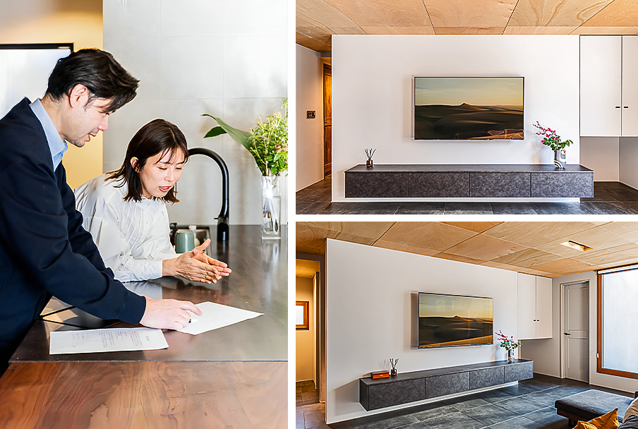 フロートタイプのテレビボードは、デザイン性の高さはもちろん、安全性や使い勝手とのバランスがとても大切なアイテムです。今回のプランが、お客さまの理想のイメージと実用性のどちらも叶えられたこと、大変嬉しく思っております。
