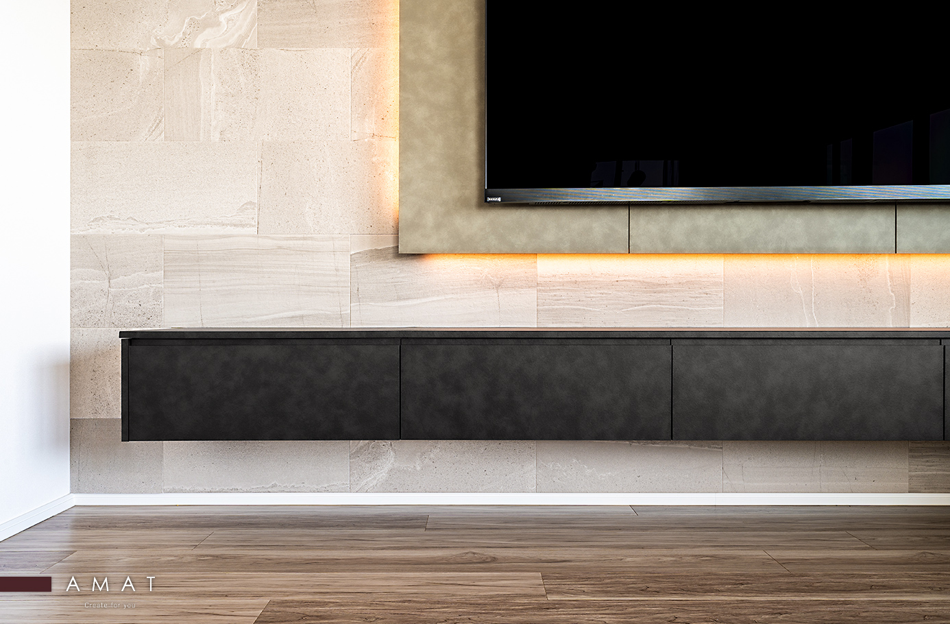 収納は最小限で、デザインに特化したリビングボードをご希望でしたので、壁掛けのテレビとフロートテレビボードをご提案させていただきました。